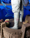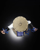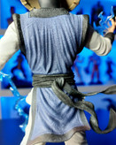 With his enigmatic face, half hidden by the shadows of a traditional Chinese straw hat, his bright white eyes refer to his supernatural status as an elderly deity, despite his human appearance. Wearing a white ninja kimono with a blue waistcoat, black bands wrapped around his wrists and a flowing black band around his waist, translucent electric lightning effects come out of his hands.