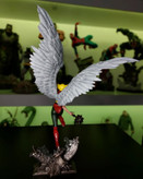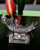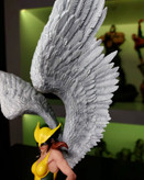 The winged warrior takes flight over her debris base that features her hawk-inspired logo, displayed breaking through a spaceship window. Hawkgirl has been sculpted in an impressive pose with her wings spread as she advances with her mace—made of mystical metal capable of affecting magical creatures—and her mighty left fist ready for combat.