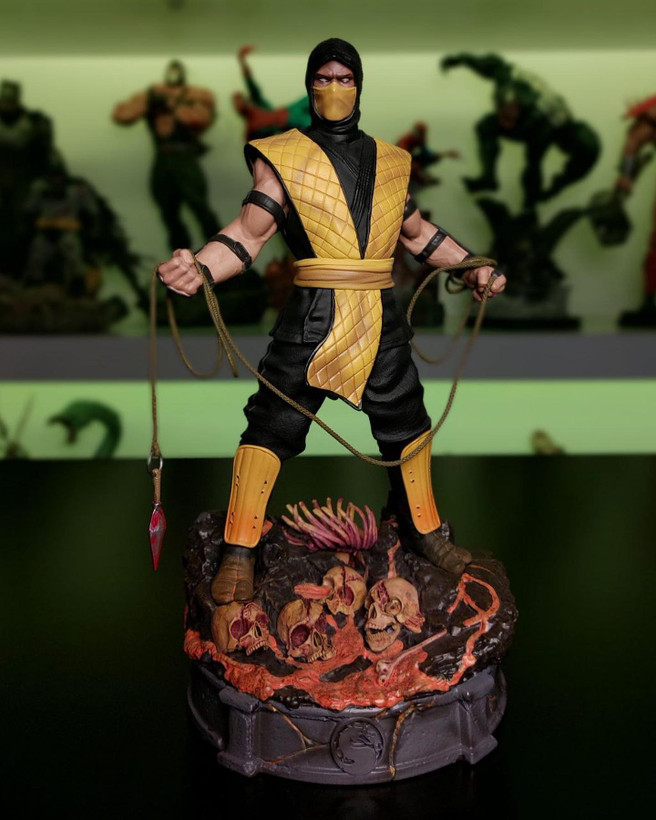 From the depths of the Netherrealm realm, the infernal underworld of Mortal Kombat, one of the most cultured and legendary warriors resurfaces in search of revenge. On a rustic base of desolate ground formed by rocks, magma, skulls and bones, the lethal ninja, with spectral eyes, clenches his fists on the rope of his Kunai. He stands ready to attack and shout “Get Over Here”, capturing the opponent and bringing him closer to finish him with a fatal blow.