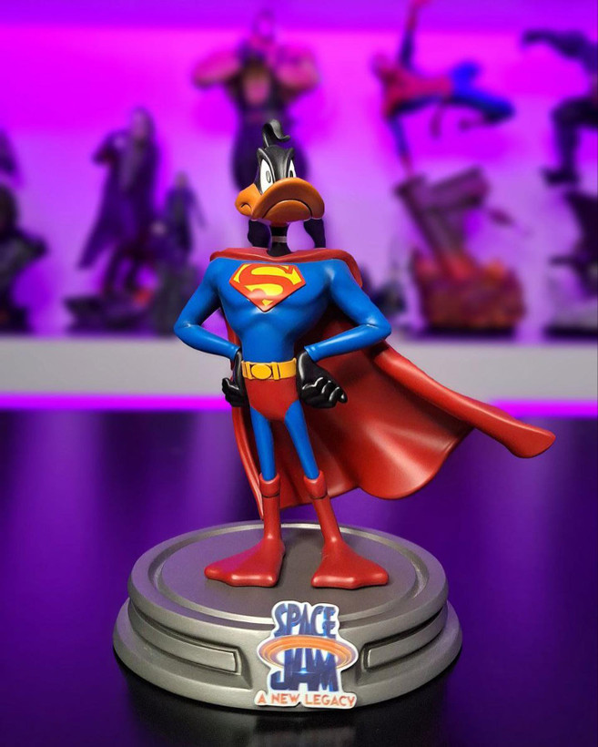 Dressed in an unmistakable blue uniform with a red cape and sporting the S-shaped symbol on his chest, the figure poses with his hands on his hips in an imposing classical heroic pose. The craziest, most self-centered, and clumsy duck in the Looney Tunes cartoon takes on the identity of Metropolis' Man of Steel, replicated by Iron Studios in the Space Jam: A New Legacy Duffy Duck Superman statue. Inspired by the movie, the beloved tongue-tied duck from the cartoons dresses up as Superman to stop a train run amok by himself.