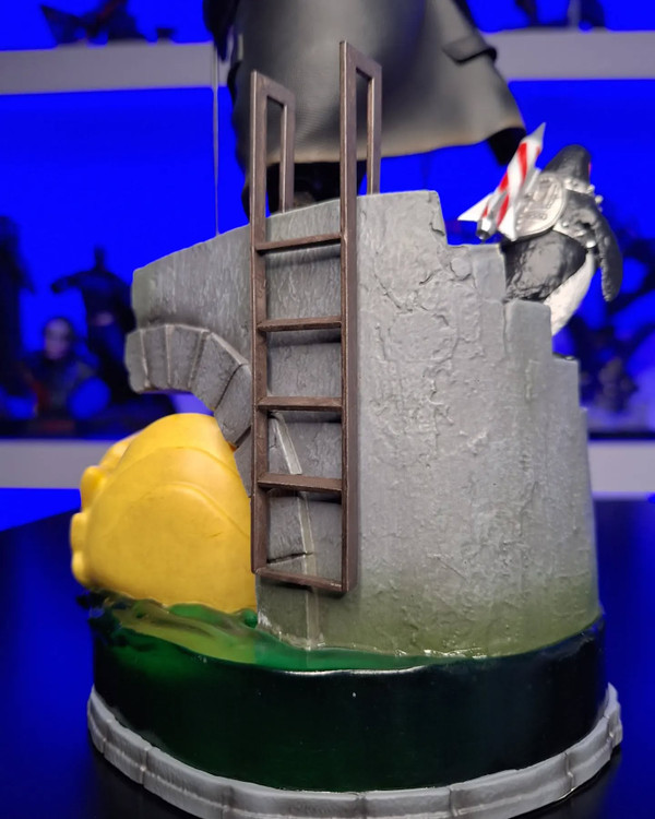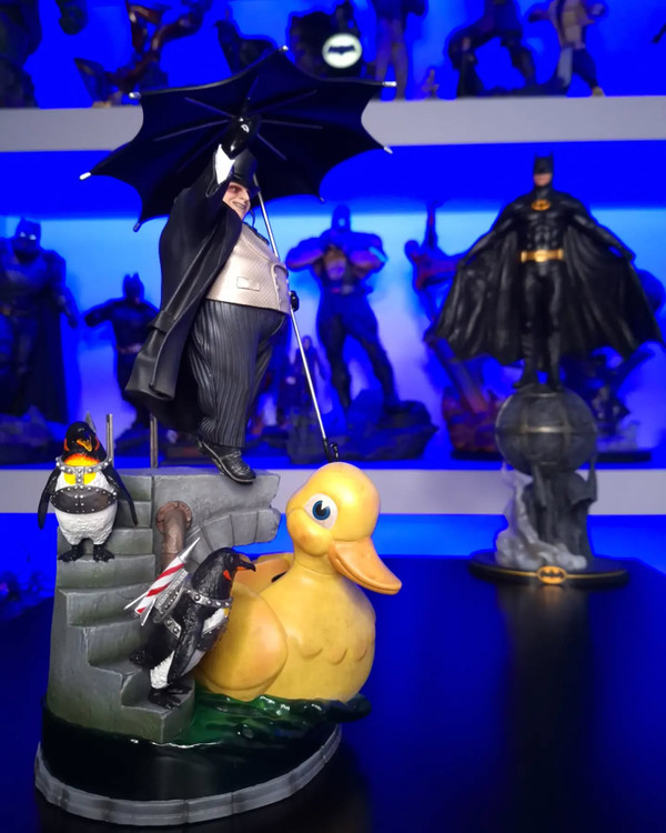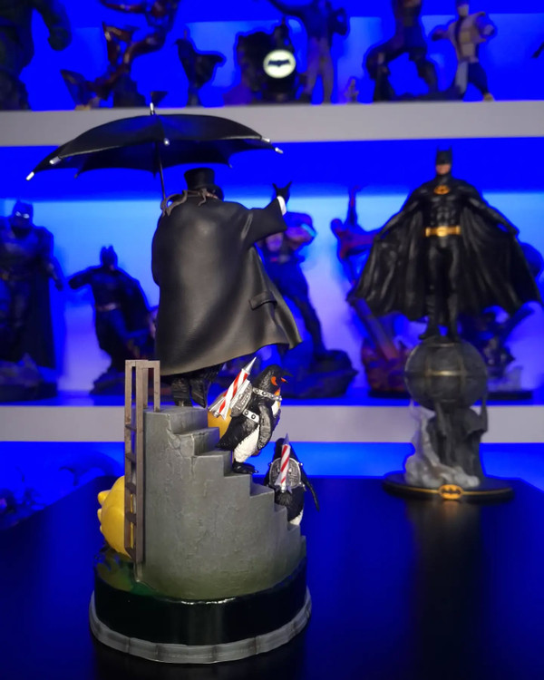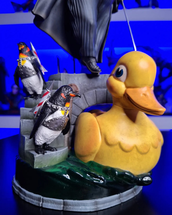 In this gorgeous diorama statue, the villain seemingly lands at the top of the staircase to his lair with his signature sadistic smile and special flying umbrella. The Penguin is dressed in his formal attire wearing a top hat and an overcoat in shades of black and gray, where 2 of his pet penguins lead him down to his floating duck vehicle—emerging from Gotham’s icy underground river galleries.