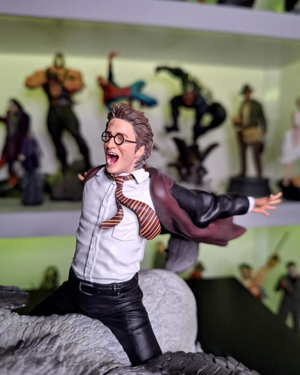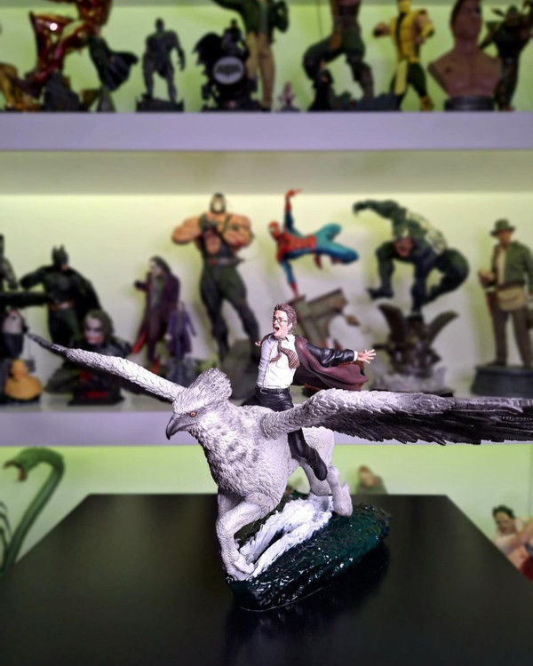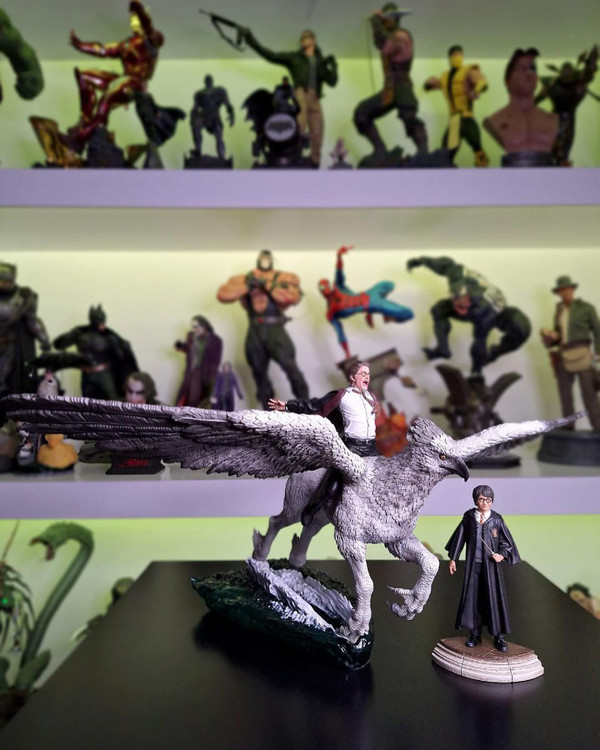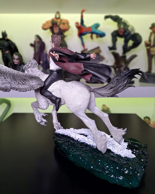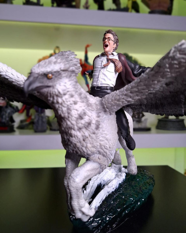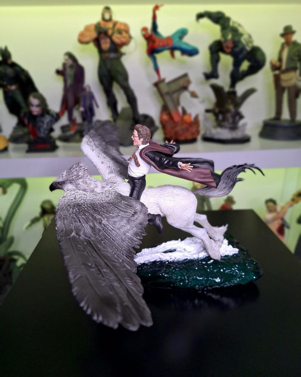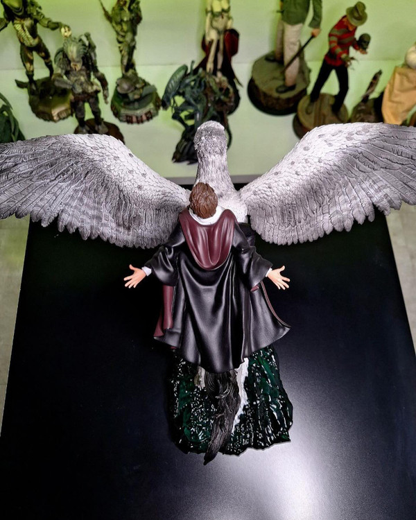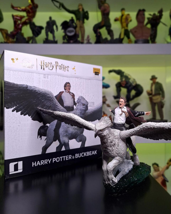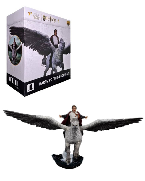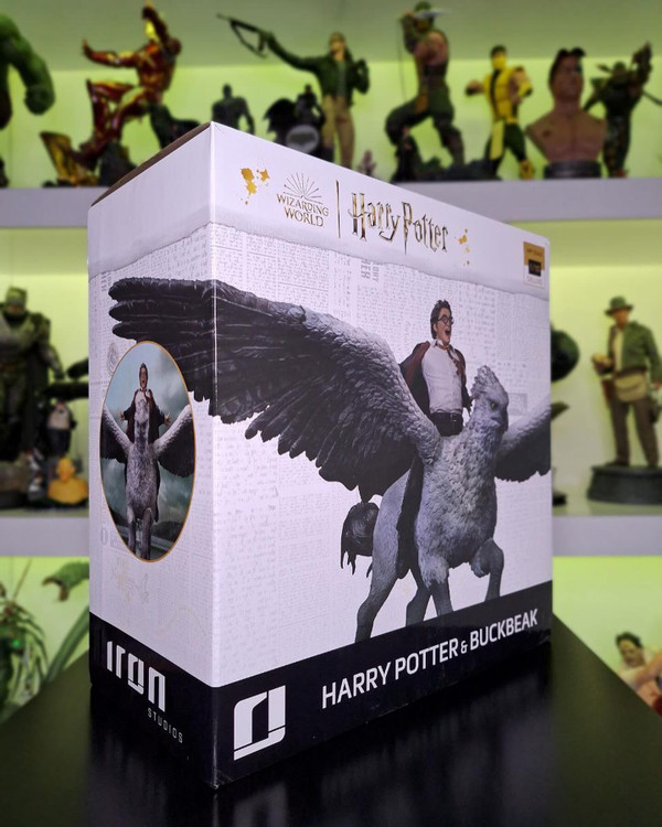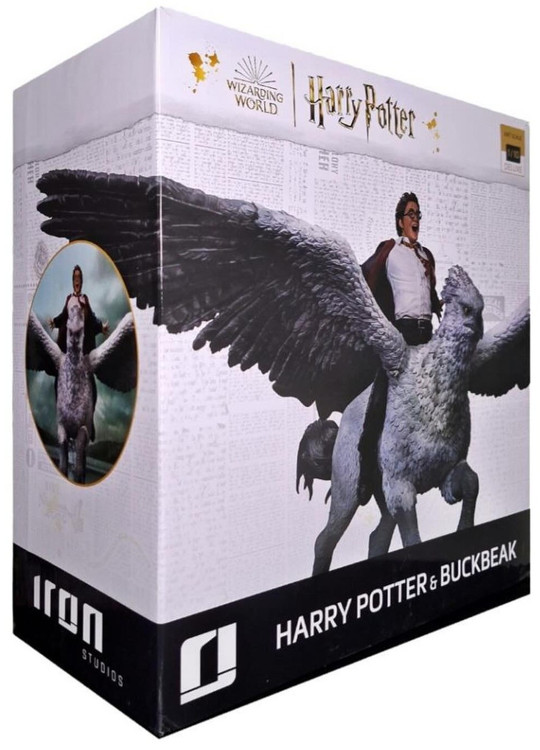 Buckbeak is a fantastic creature known as a hippogriff, with a gray tinge. Its back, legs, and paws are like those of a horse, and its head and its front are like a bird of prey. The fantastic creature even has long wings that allow it to fly. Enthusiastic and full of adrenaline provided by his first flight riding through the skies of Hogwarts, the young wizard Harry Potter screams and opens his arms when his new friend slides his right front paw across the waters of a lake in a sweeping maneuver. This iconic scene from the movie Harry Potter and the Prisoner of Azkaban is also proudly replicated by Iron Studios in this highly detailed, limited edition statue.