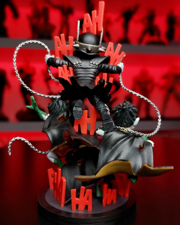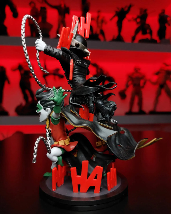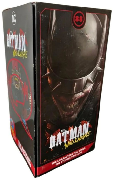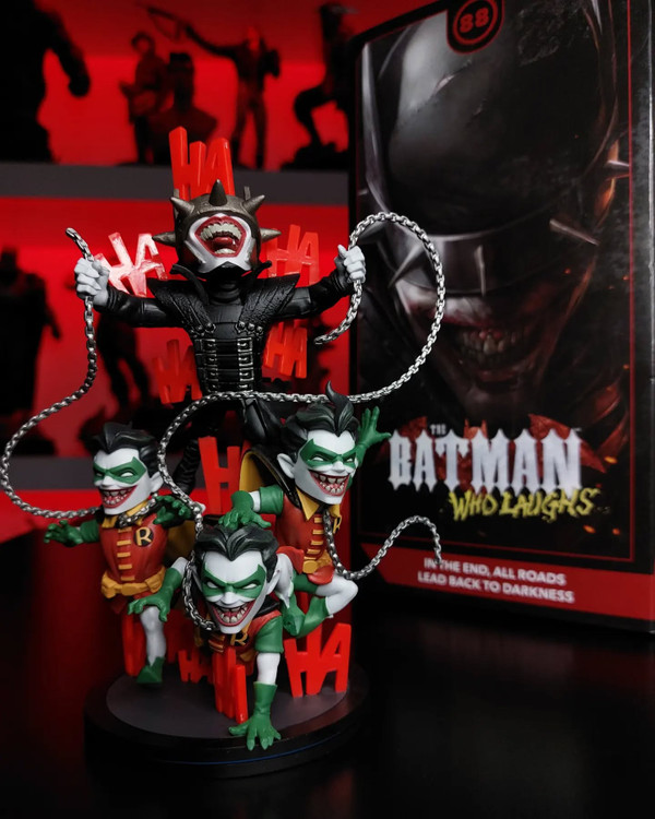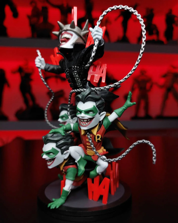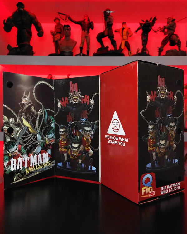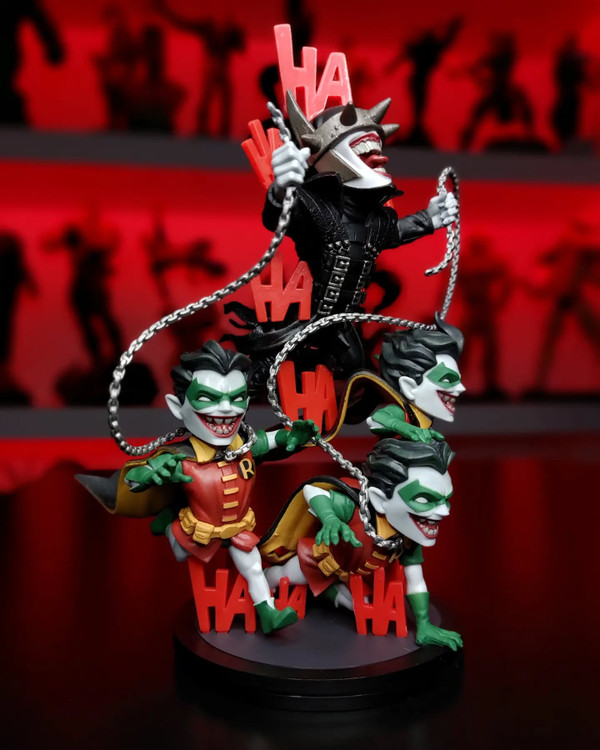 The Batman Who Laughs Q-Fig Max Elite stands tall among other Batman collectibles: At approximately 7.5 inches high, this Q-Fig’s commanding presence will take center stage in any collection. Featuring the Batman Who Laughs and three Rabid Robins, the nefarious foursome are surrounded by the Joker’s unmistakable laughter and this Batman’s weapon of choice - a deadly metal chain. Batman’s horrifying metal crown empowers him with the ability to discover the fears of his victims, resting just above the gleeful grin once belonging to the clown prince of crime.