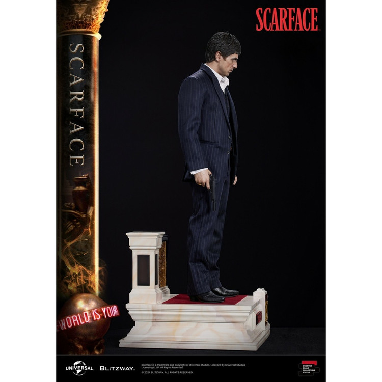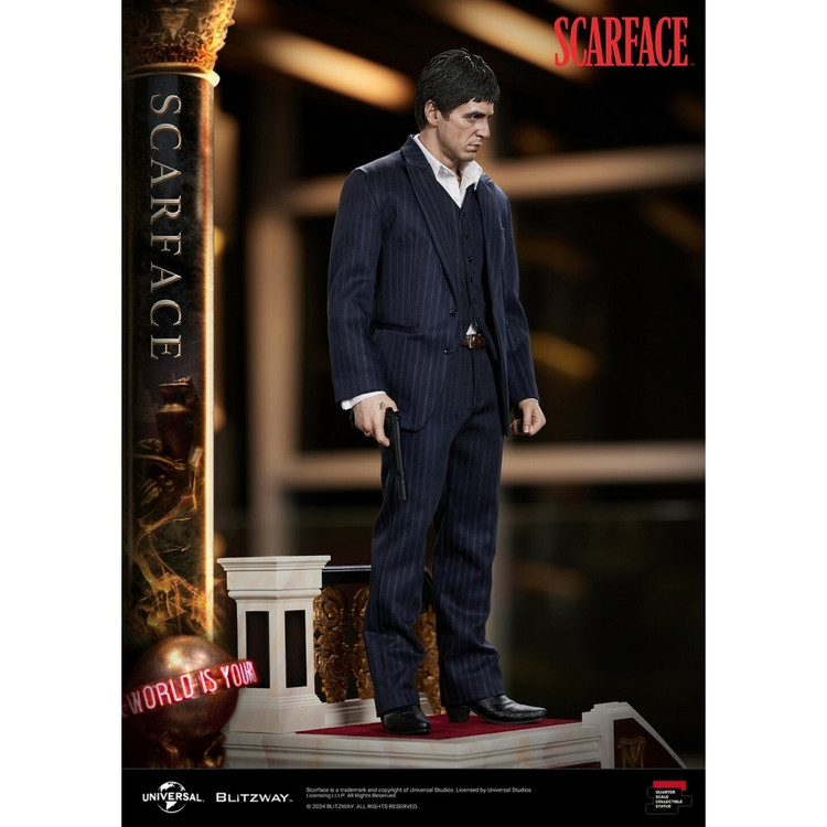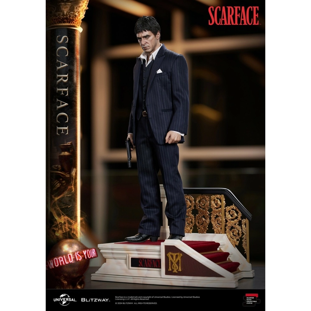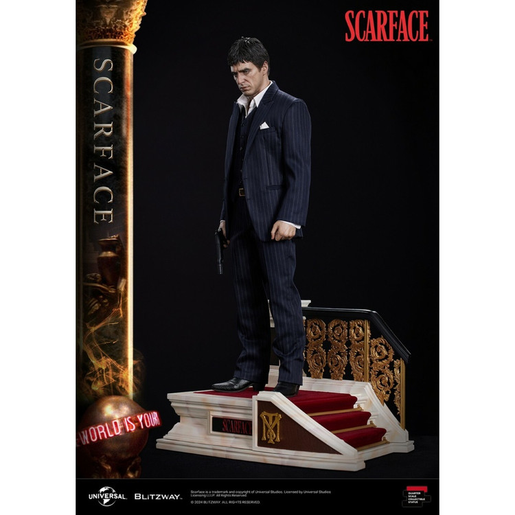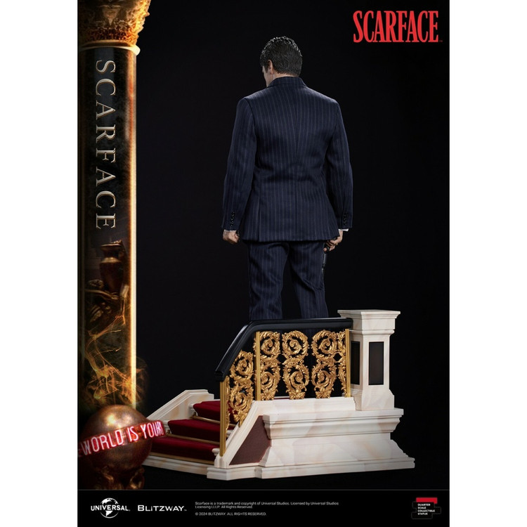 This figure encapsulates Tony Montana's journey of moral decay amidst his escalating pursuit of success, accentuated by opulent suits and a diorama base representing a pivotal scene from the film. With lavish golden railings, plush red carpet stairs, and Tony Montana's poised figure, Blitzway’s "Scarface" captures the nuanced moments of contrast in his expressions.