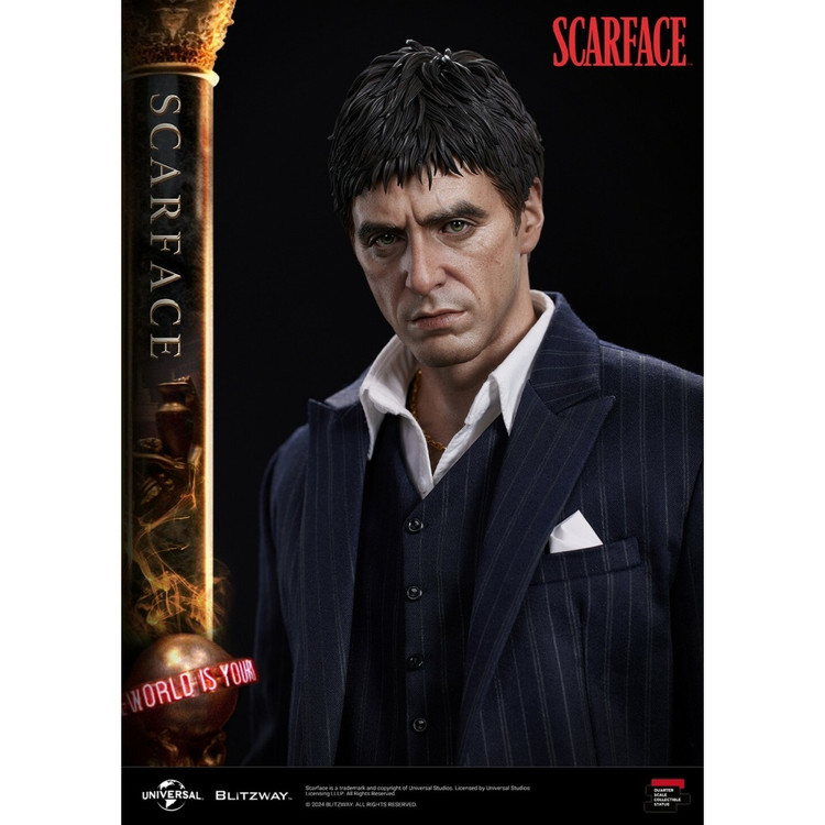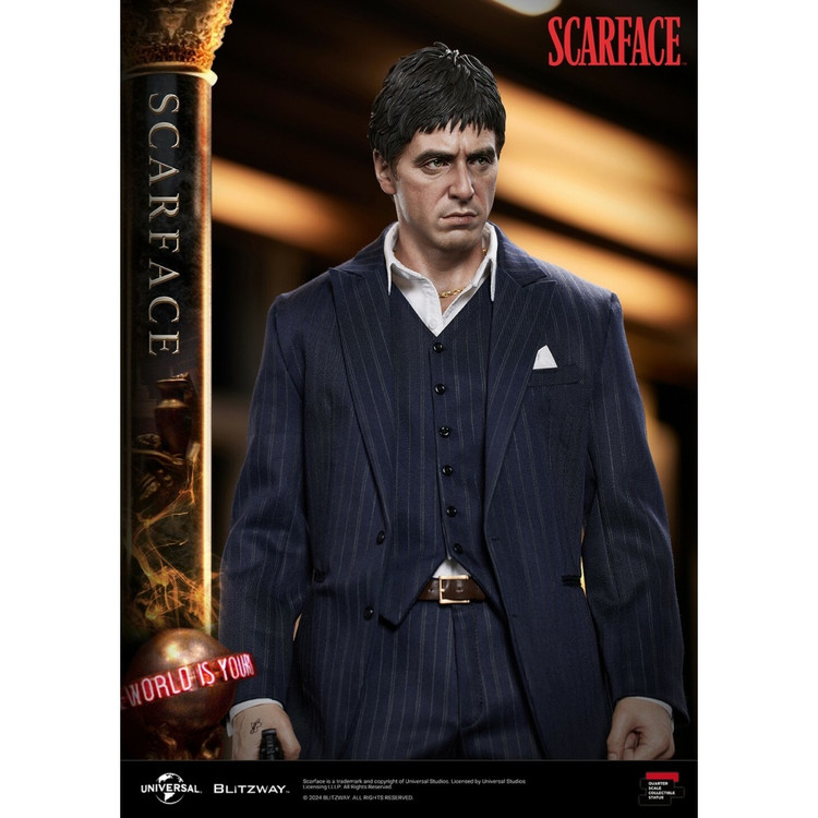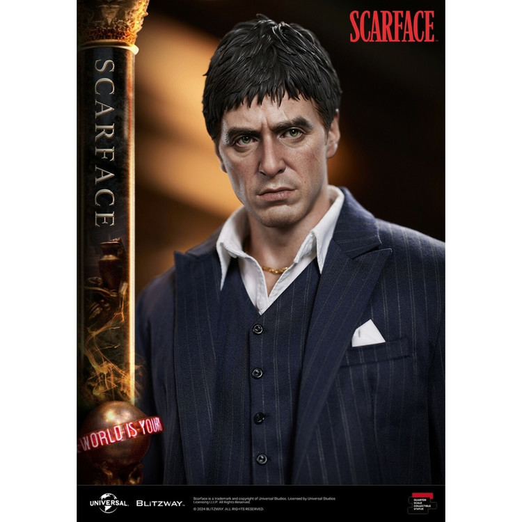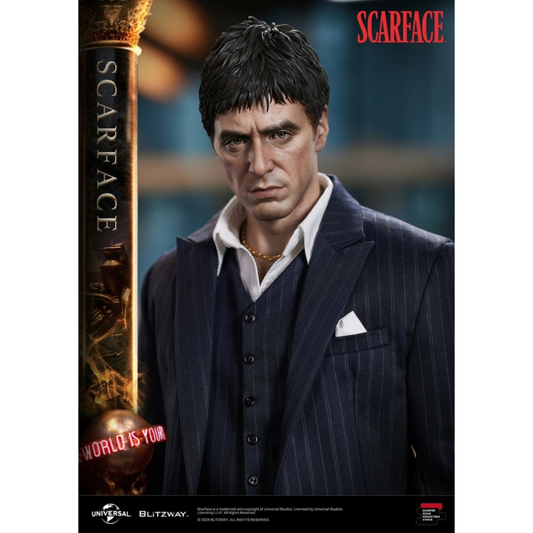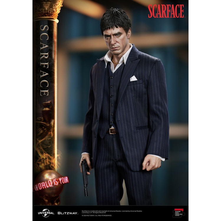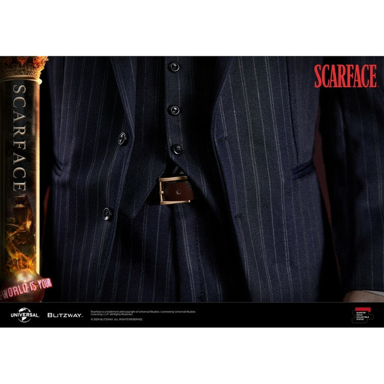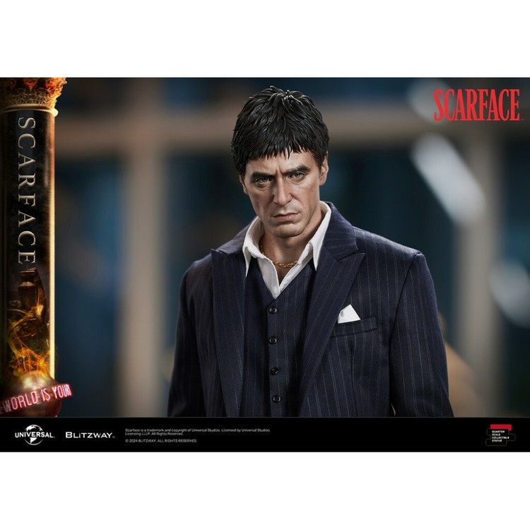 Portrayed by legendary actor Al Pacino, Tony Montana's portrayal vividly captures the character's criminal facade, inner turmoil, and the gradual erosion of his humanity. Pacino's commanding presence and intense gaze, masterfully depicted in "Scarface," are meticulously recreated through resin head sculpts and Blitzway's eye insertion techniques.