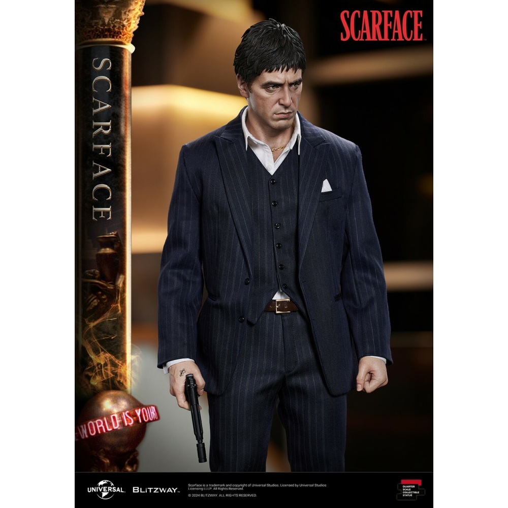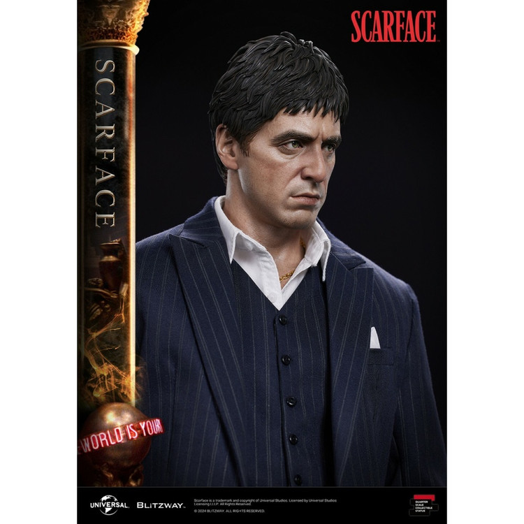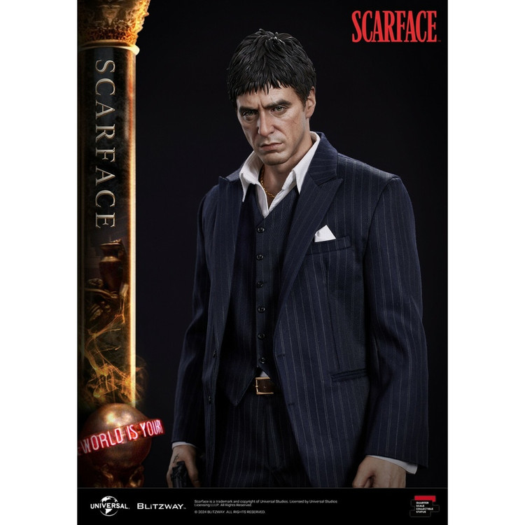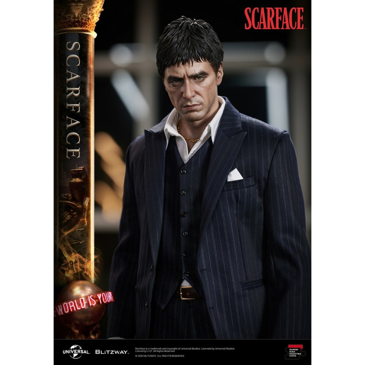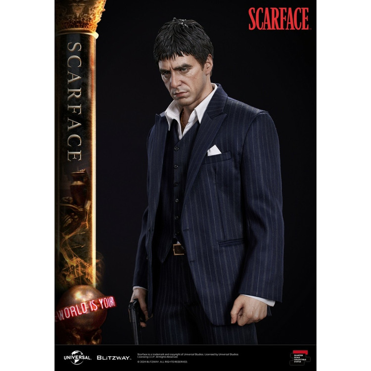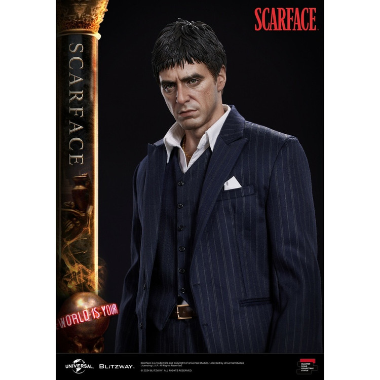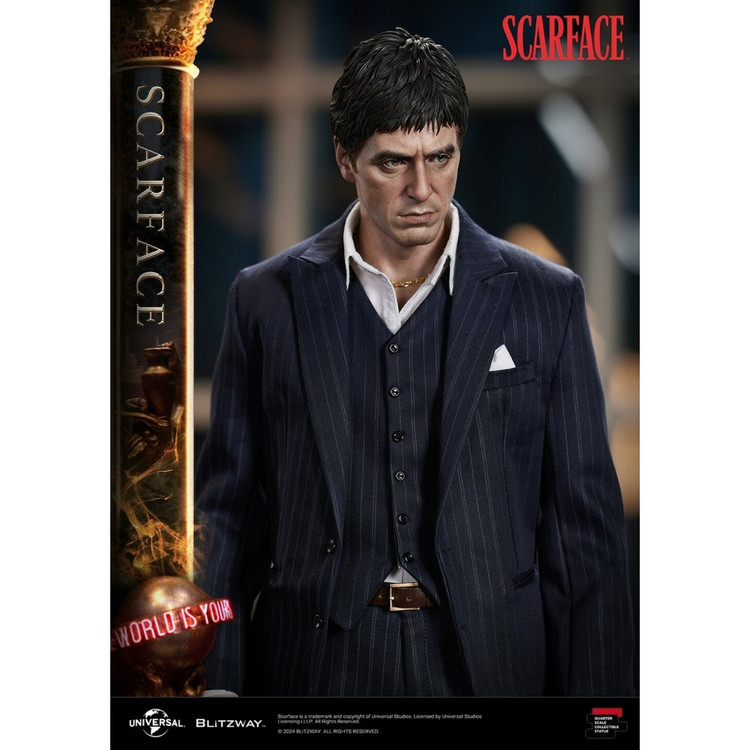 Portrayed by legendary actor Al Pacino, Tony Montana's portrayal vividly captures the character's criminal facade, inner turmoil, and the gradual erosion of his humanity. Pacino's commanding presence and intense gaze, masterfully depicted in "Scarface," are meticulously recreated through resin head sculpts and Blitzway's eye insertion techniques.
