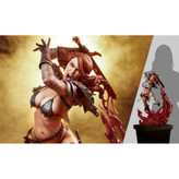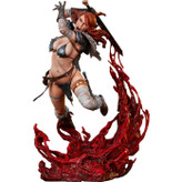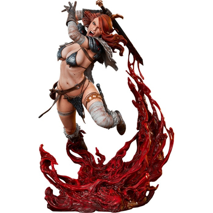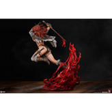 The Red Sonja: A Savage Sword Premium Format Figure shows the Hyrkanian heroine in the middle of a gory frenzy. As she leaps to slash at more unseen foes, the trail of blood behind her reveals the spirits of past victims screaming in agony. Her sword and body are splattered with carnage, but Red Sonja's eyes only see a rage-filled path to victory.