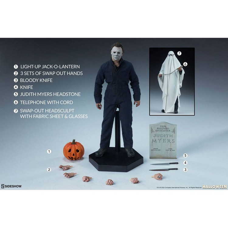 The Michael Myers Deluxe Sixth Scale Figure includes a variety of accessories to recreate multiple cinematic moments in your collection. The figure comes with eight different hands, including a pair of fists, a pair of grip hands, a pair of open hands, and a pair of posed gesture hands for interacting with his killer tools of the trade. Michael Myers also includes both a clean knife and bloody knife for holding, as well as a corded telephone accessory, perfect for terrorizing teenagers on Halloween night. The figure also features a Judith Myers headstone accessory and a carved Jack-O-Lantern with a light-up feature, both of which can be placed in proximity to the figure to create a more detailed Halloween scene.