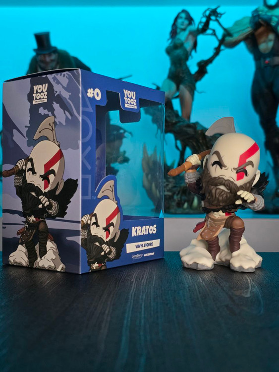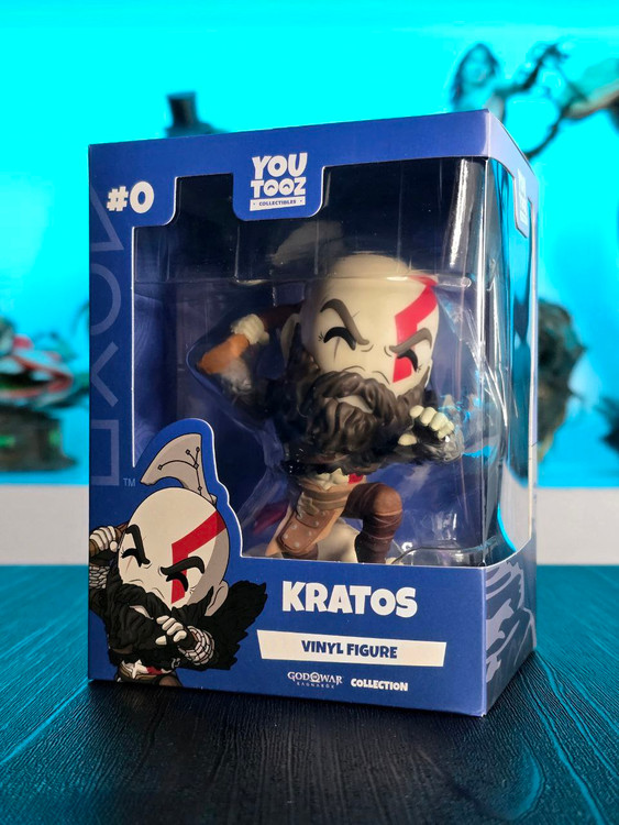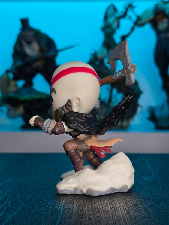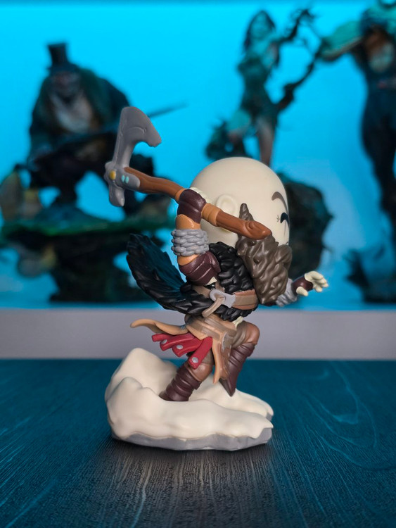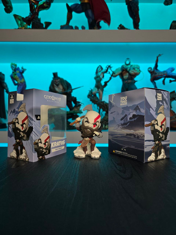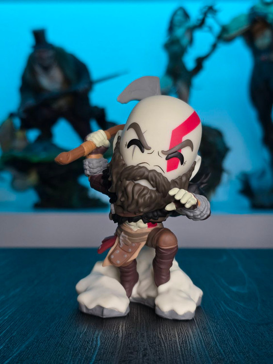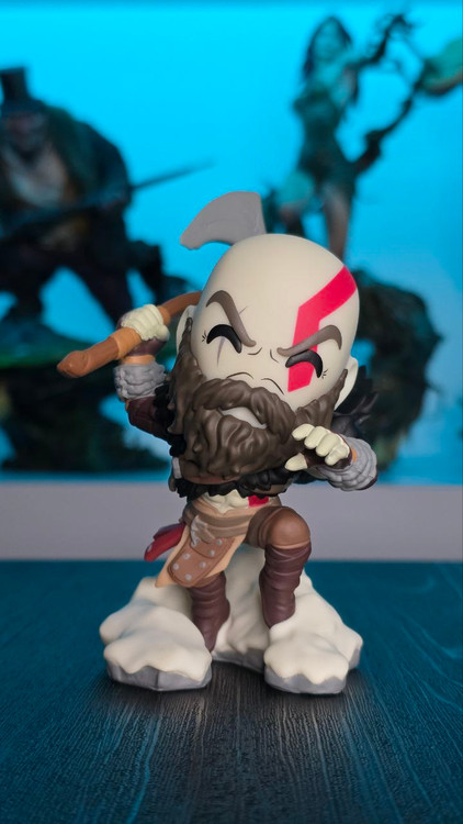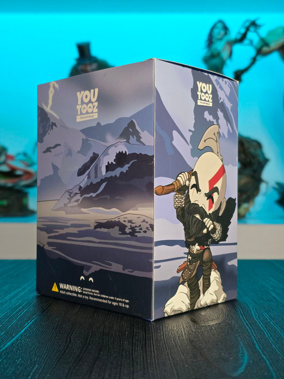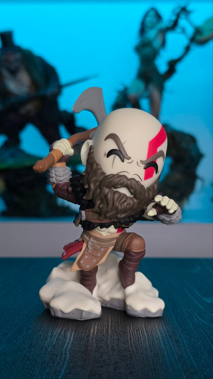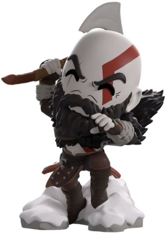 Kratos has some unfinished business with Youtooz… wait a minute! It’s for his debut, right?! Leaping forward through thick white snow at 5 inches tall and posed ready to unleash a devastating downward cleave from the axe raised behind his head, a thick black beard covers his face as a scar crosses one eye and a thick red tattoo runs over his head and across the other. With a black cloak flowing behind him from the force of his lunge, he wears simple brown leather armour around his arms and legs with chains wrapped around his forearms and belts around his waist.