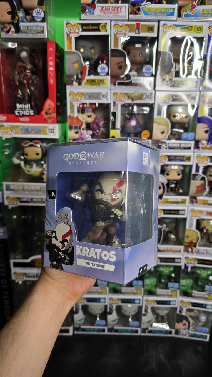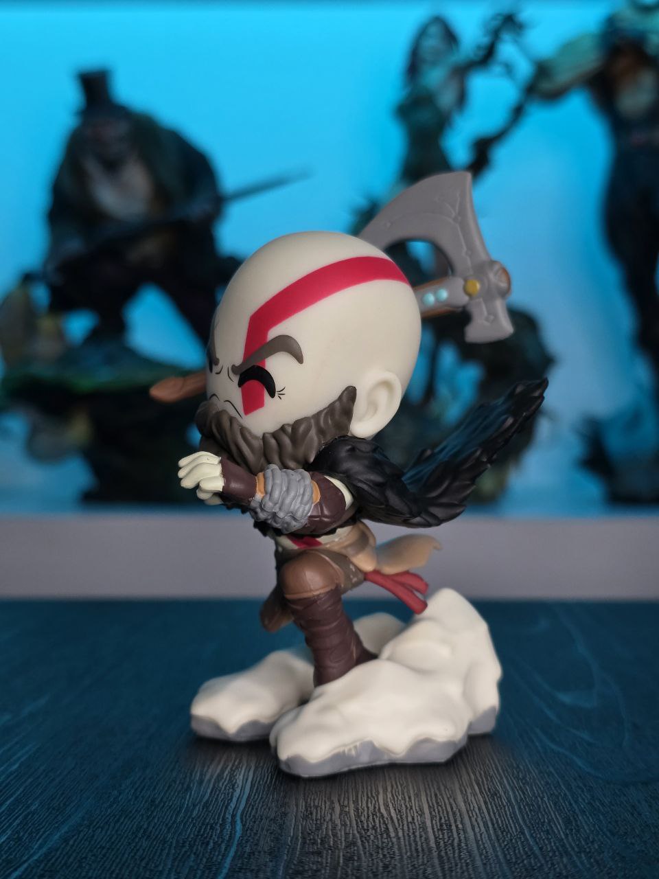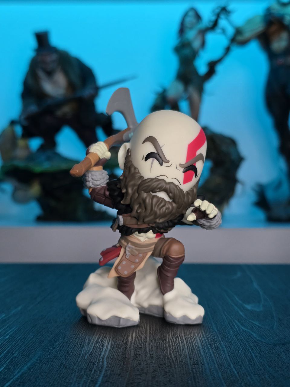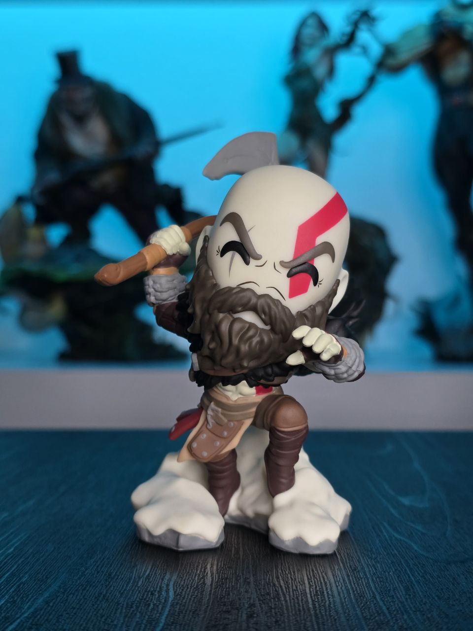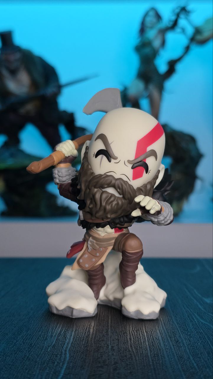 Kratos has some unfinished business with Youtooz… wait a minute! It’s for his debut, right?! Leaping forward through thick white snow at 5 inches tall and posed ready to unleash a devastating downward cleave from the axe raised behind his head, a thick black beard covers his face as a scar crosses one eye and a thick red tattoo runs over his head and across the other. With a black cloak flowing behind him from the force of his lunge, he wears simple brown leather armour around his arms and legs with chains wrapped around his forearms and belts around his waist.