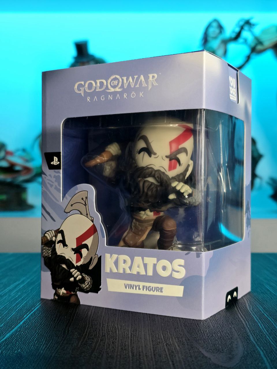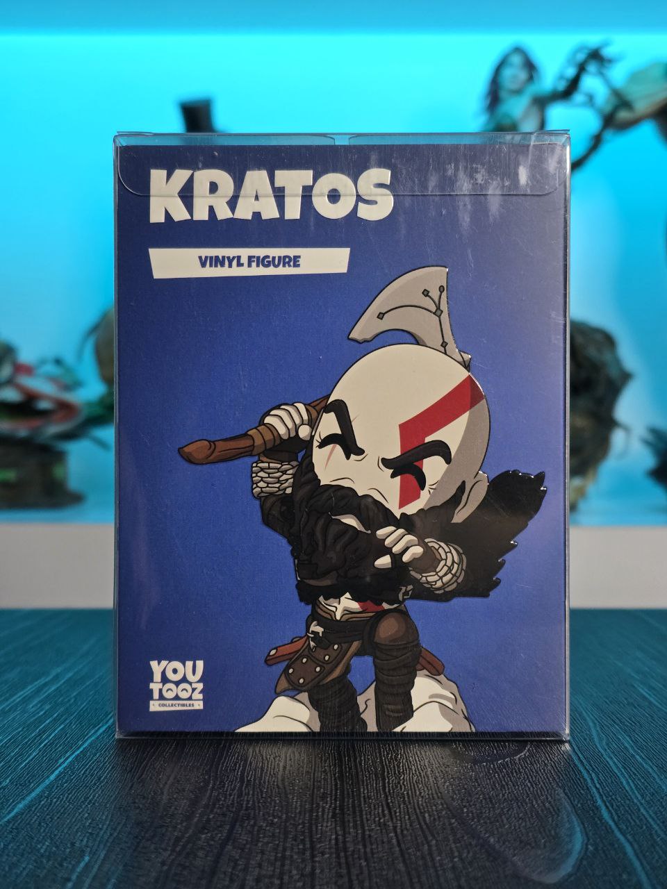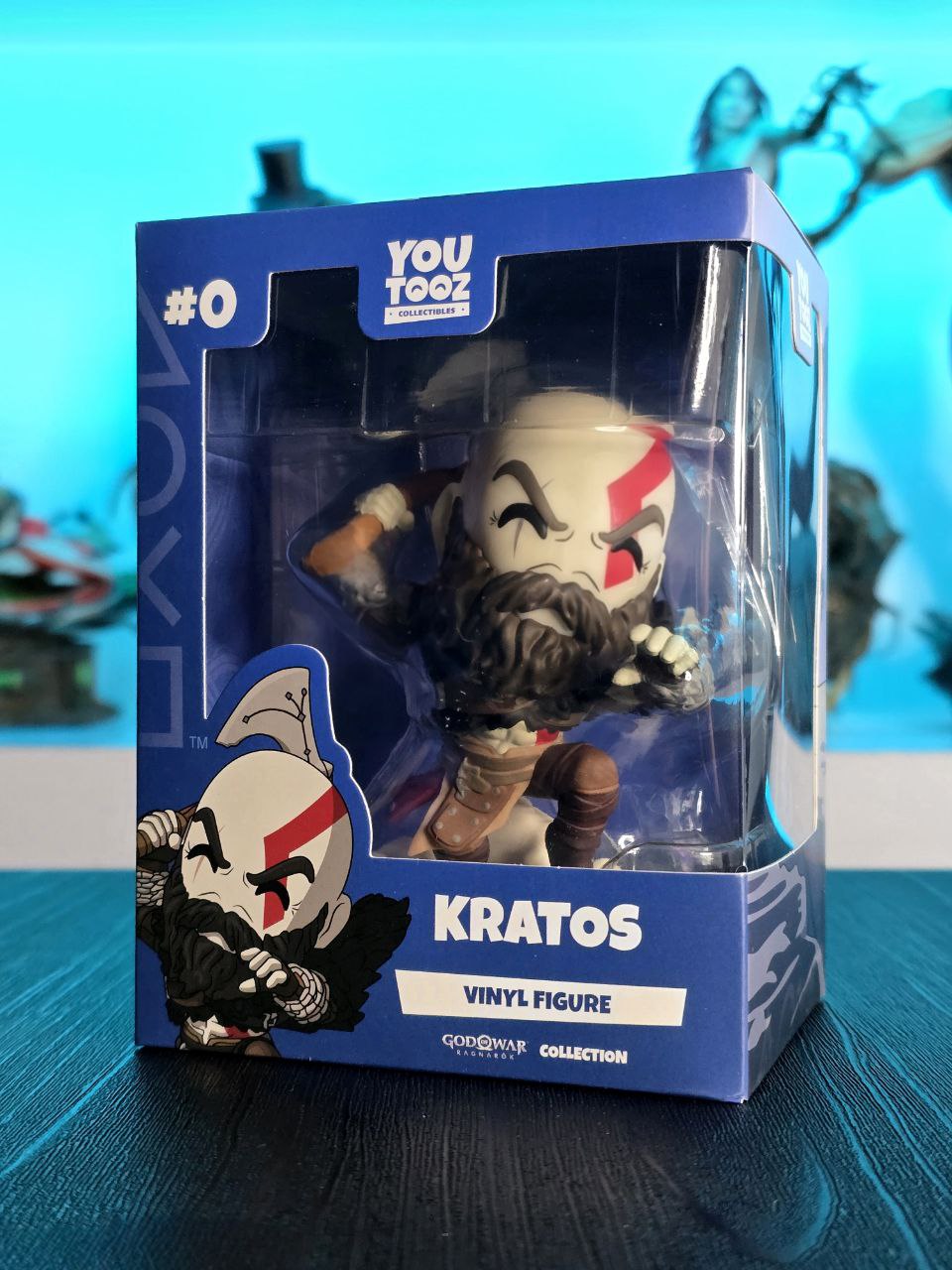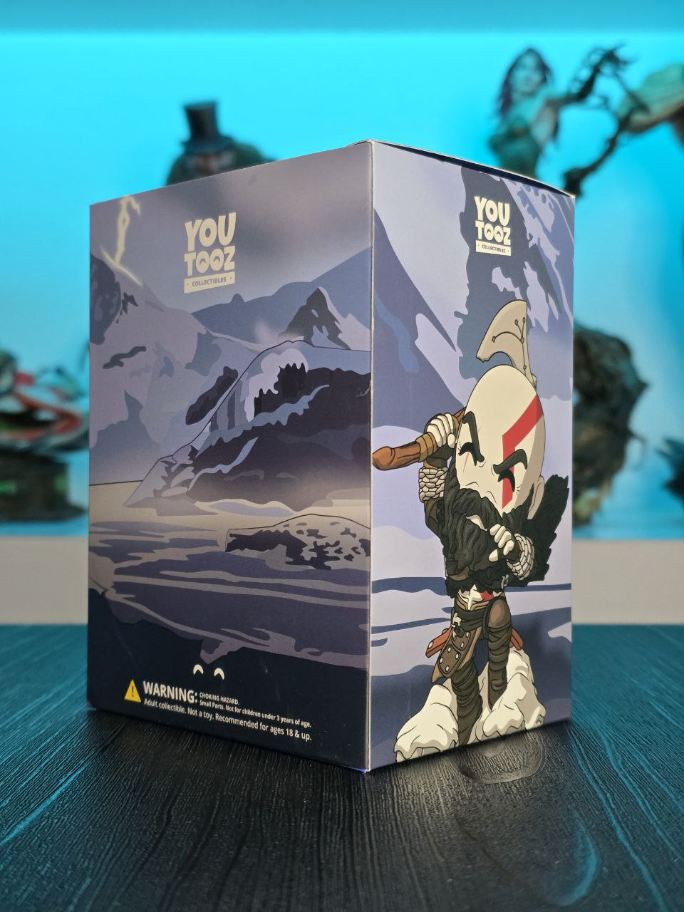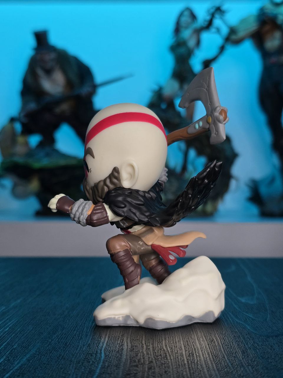 Kratos has some unfinished business with Youtooz… wait a minute! It’s for his debut, right?! Leaping forward through thick white snow at 5 inches tall and posed ready to unleash a devastating downward cleave from the axe raised behind his head, a thick black beard covers his face as a scar crosses one eye and a thick red tattoo runs over his head and across the other. With a black cloak flowing behind him from the force of his lunge, he wears simple brown leather armour around his arms and legs with chains wrapped around his forearms and belts around his waist.