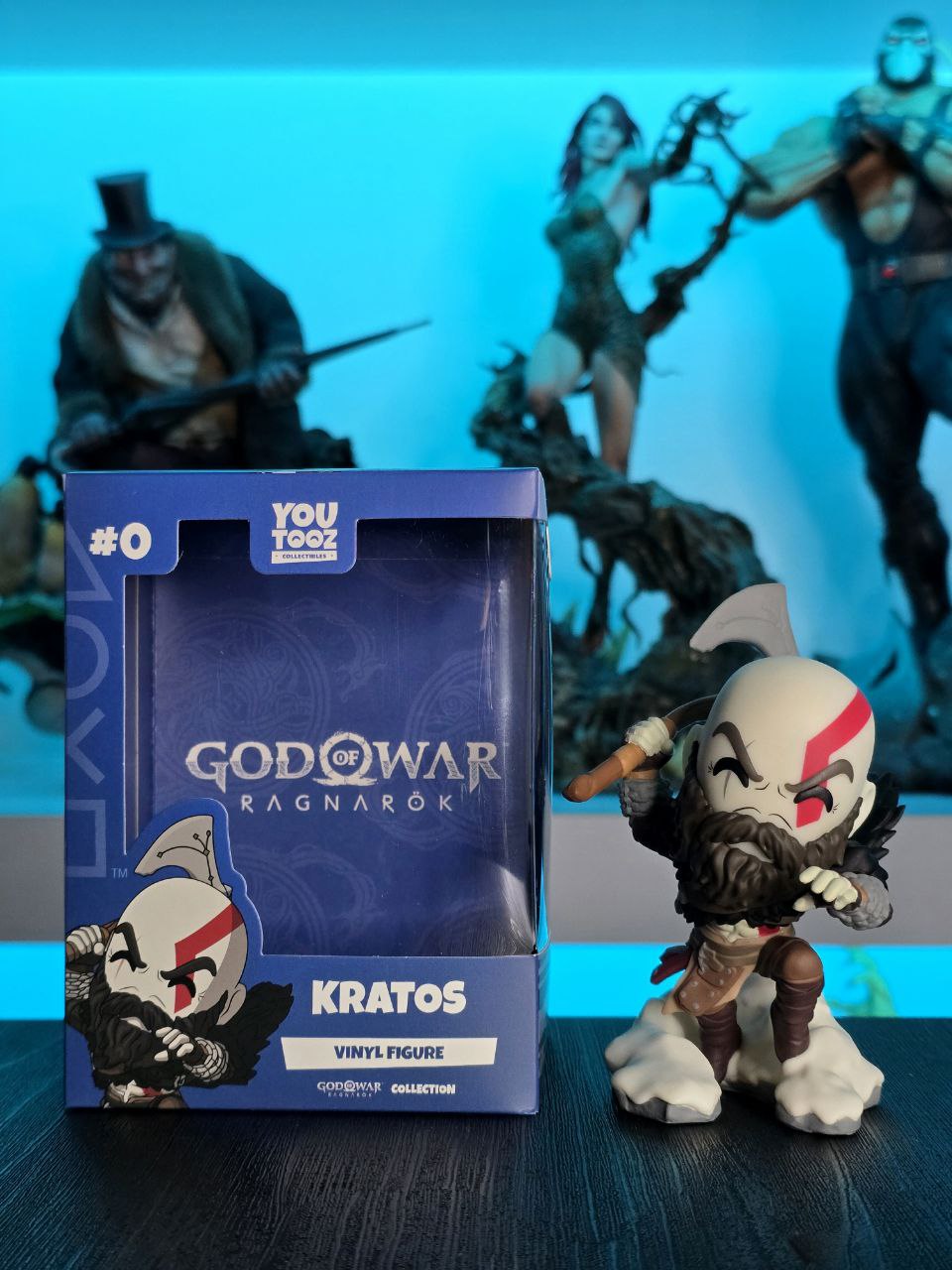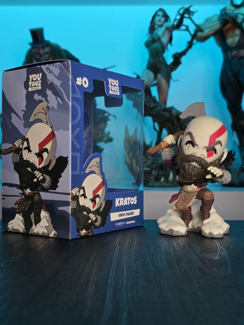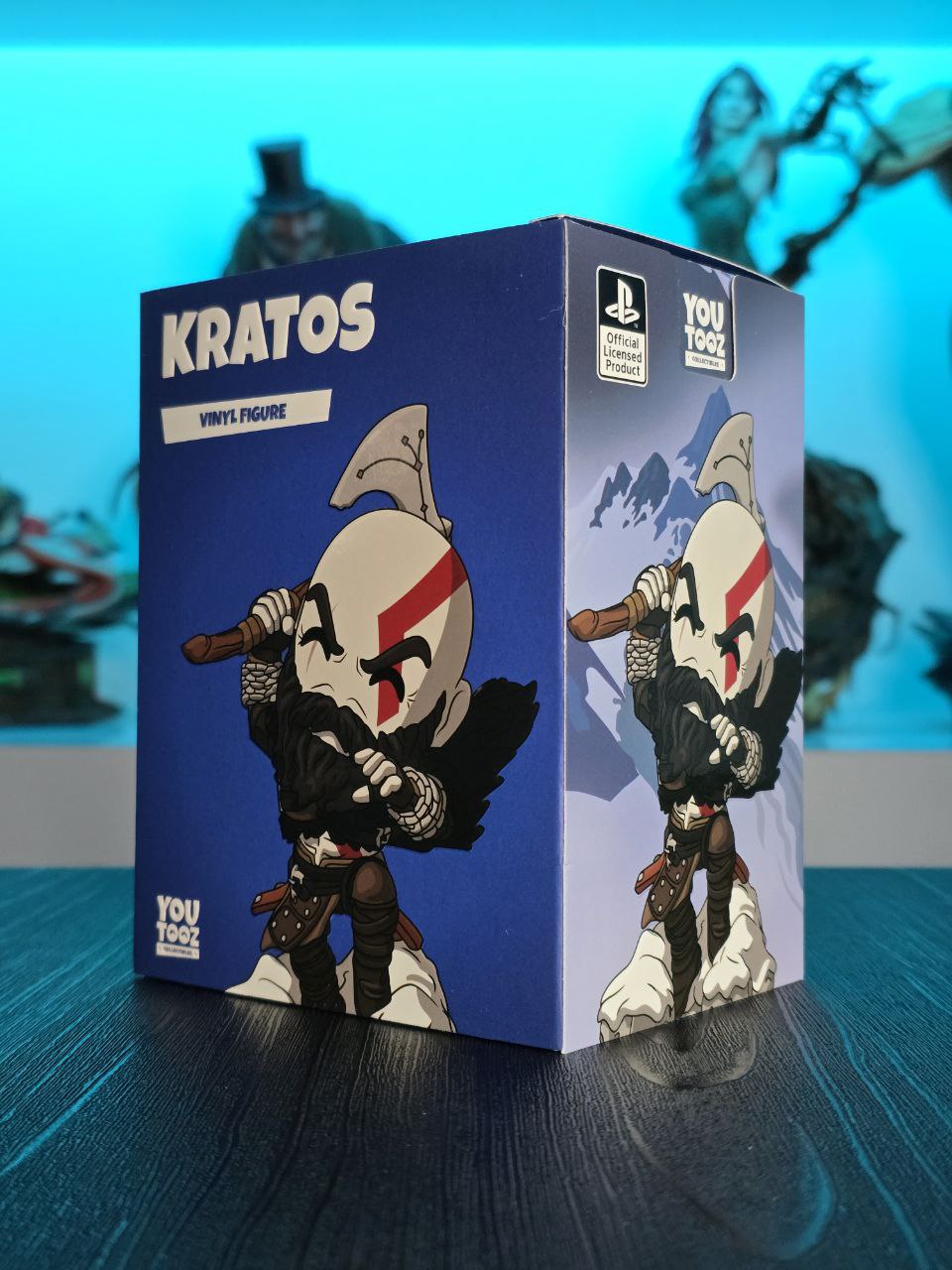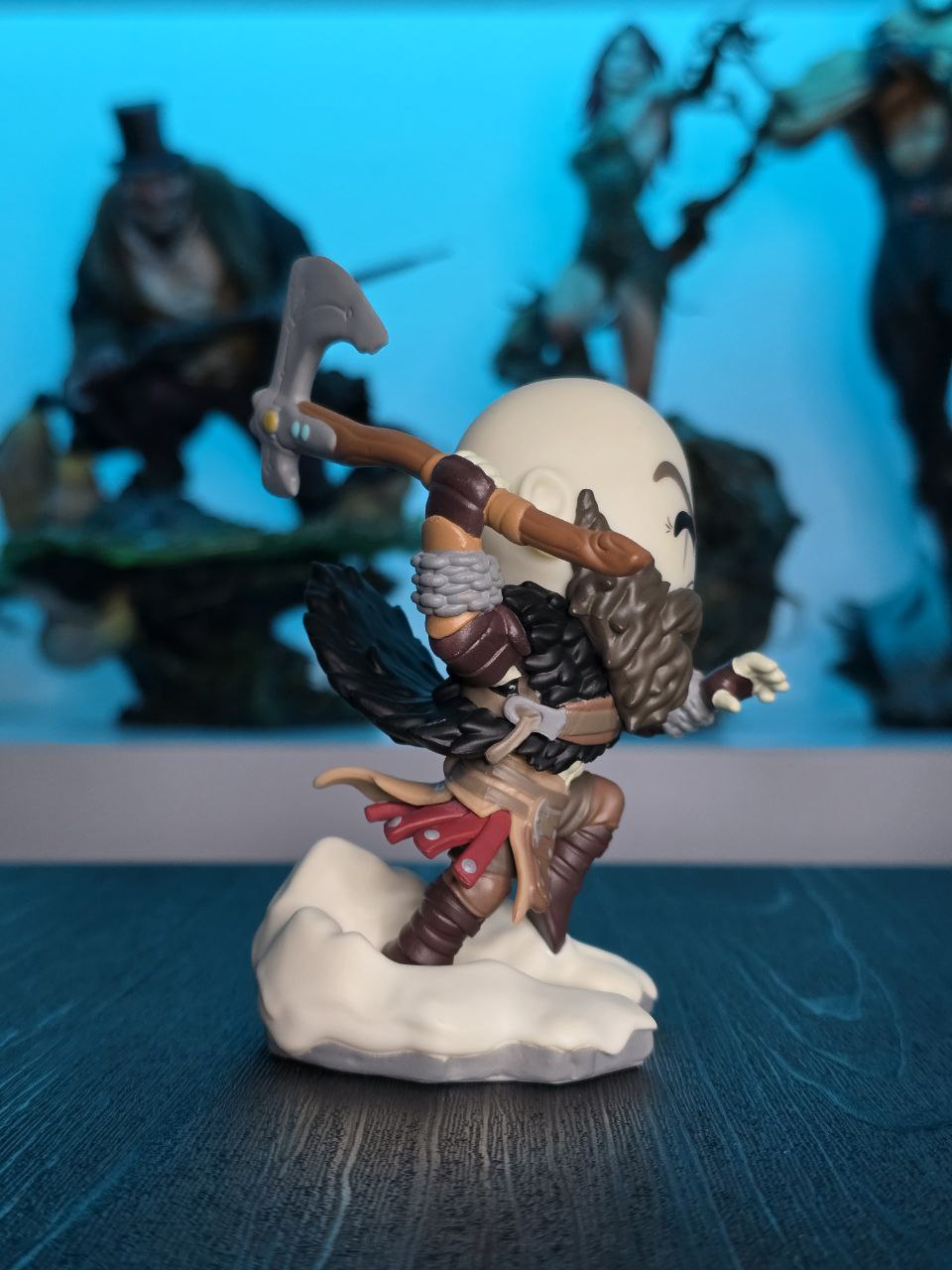 Kratos has some unfinished business with Youtooz… wait a minute! It’s for his debut, right?! Leaping forward through thick white snow at 5 inches tall and posed ready to unleash a devastating downward cleave from the axe raised behind his head, a thick black beard covers his face as a scar crosses one eye and a thick red tattoo runs over his head and across the other. With a black cloak flowing behind him from the force of his lunge, he wears simple brown leather armour around his arms and legs with chains wrapped around his forearms and belts around his waist.