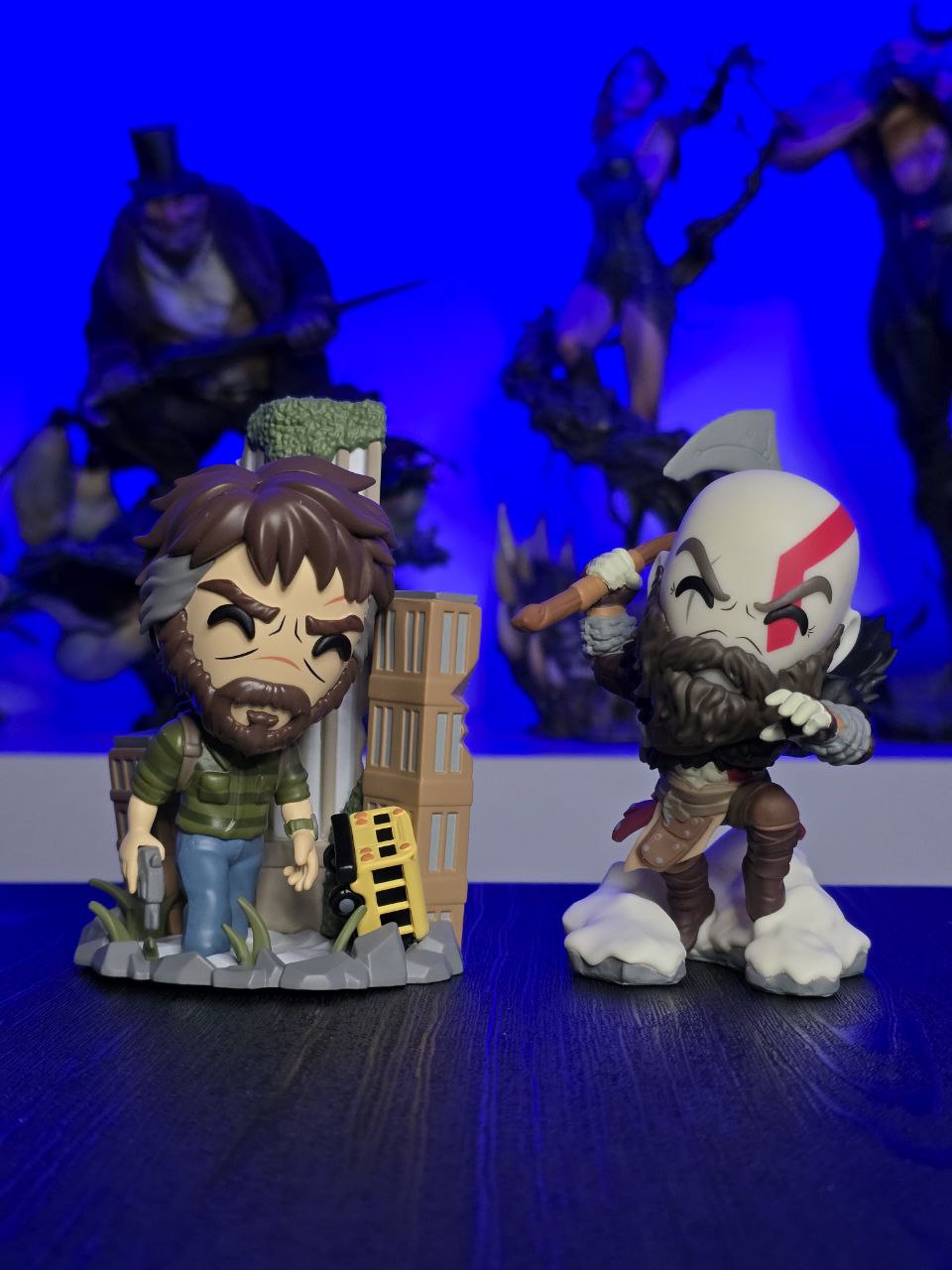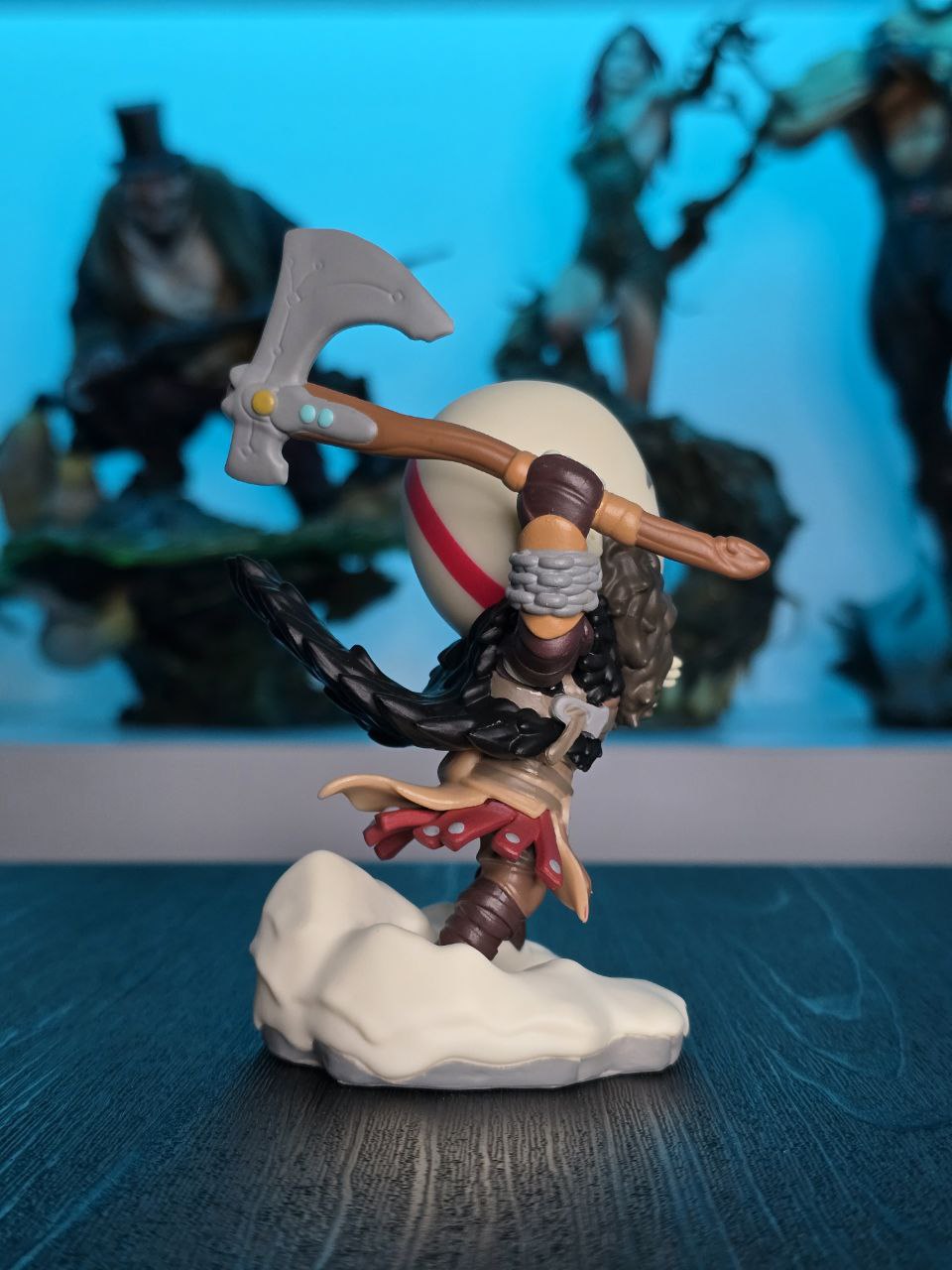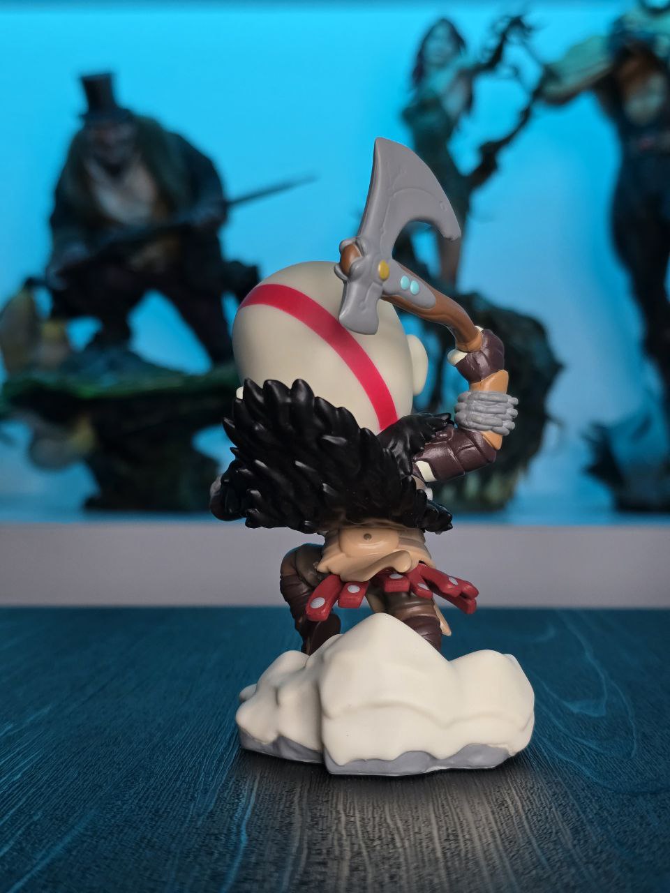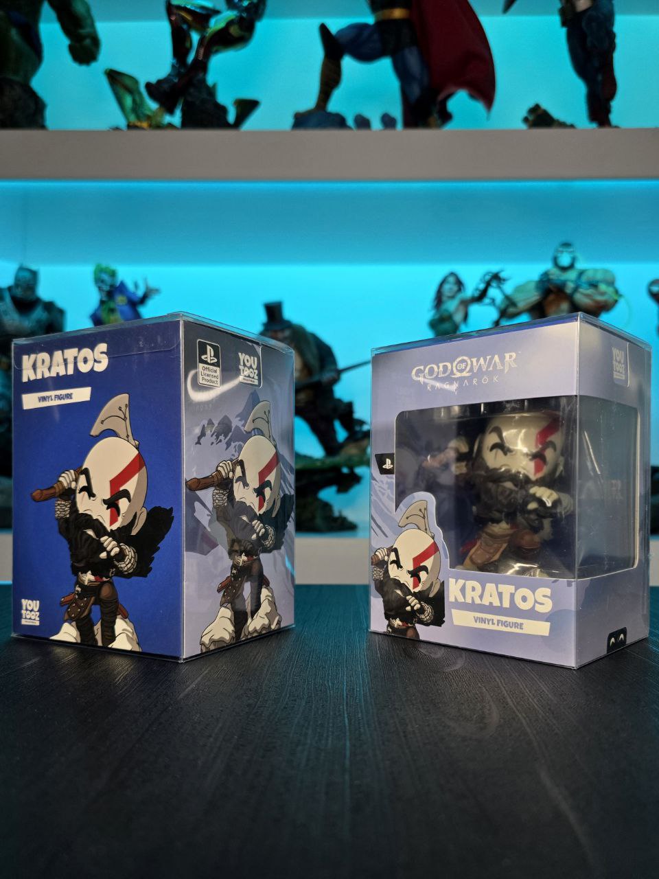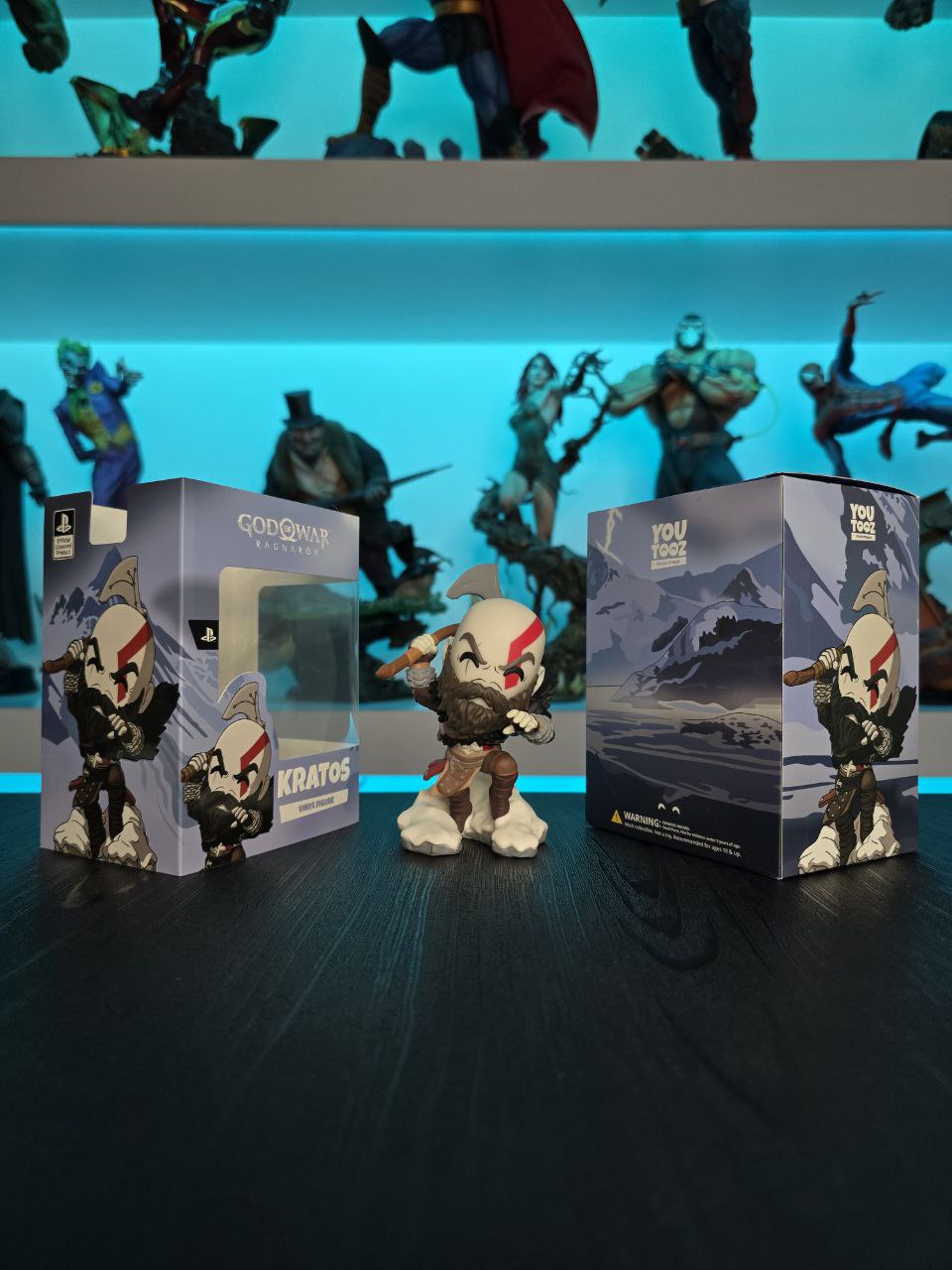 Kratos has some unfinished business with Youtooz… wait a minute! It’s for his debut, right?! Leaping forward through thick white snow at 5 inches tall and posed ready to unleash a devastating downward cleave from the axe raised behind his head, a thick black beard covers his face as a scar crosses one eye and a thick red tattoo runs over his head and across the other. With a black cloak flowing behind him from the force of his lunge, he wears simple brown leather armour around his arms and legs with chains wrapped around his forearms and belts around his waist.